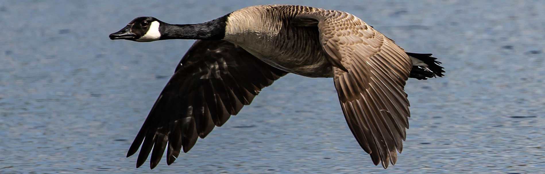 The Canada Goose is very recognizable, black head, white cheek patches and long black neck. There are several different “races” of Canada Geese. The smallest one - the cackling Canada Goose is only about 1.1 kg, while the Giant Canada Goose - the largest, weighs up to 8 kg. Wing span on the smaller birds is just under a metre while the larger birds can be just over 2 metres. The underbelly can range from light grey to chestnut brown, sometimes almost blackish brown.